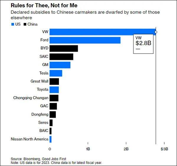 根据“优质岗位第一”组织的数据,大众汽车北美公司在2023年获得的补贴金额高于中国汽车制造商在同一财年宣布的任何补贴。福特汽车公司获得的补贴也比任何一家中国竞争对手多。