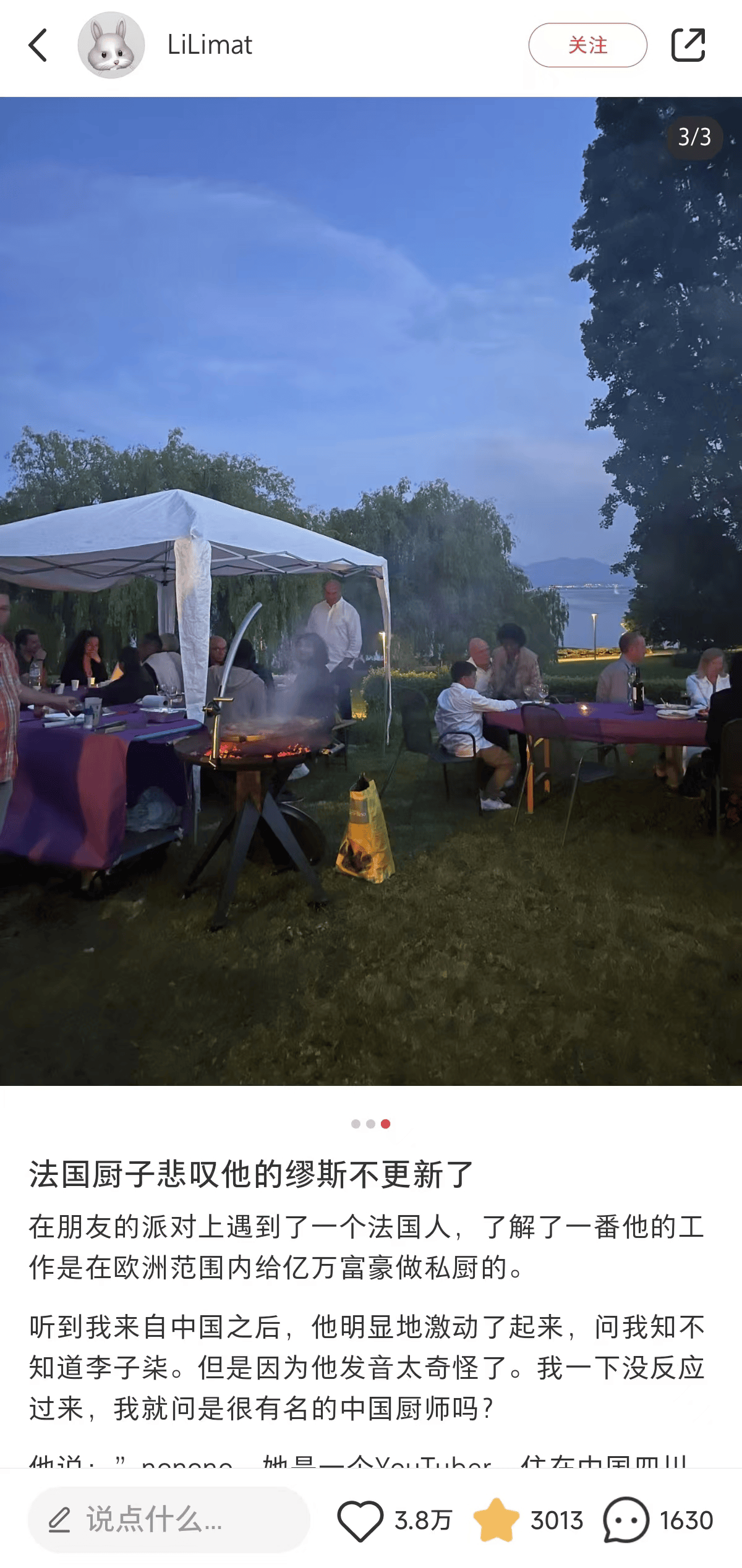 在李子柒离开的1217天里,国内外的粉丝一直都在期待着她的归来。去年5月,小红书网友@lilimat分享的一个李子柒的故事上了热搜。她在派对上遇见了一个法国厨师,听说她来自中国,厨师倾诉自己的东方缪斯李子柒不更新了。在得知李子柒因为跟公司有纠纷才断更后,厨子更是叹道:“她的粉丝真的很需要她的视频。”李子柒的全球影响力可见一斑。