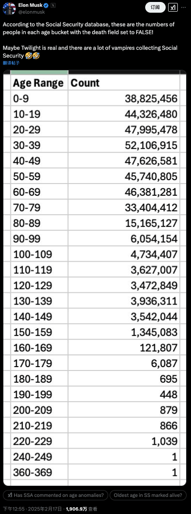 最新的案例,来自美国社保数据库。本月早些时候,马斯克曾喊话称,美国的社保系统正在向“150岁的人”支付福利,但真实的数据更加令人诧异。