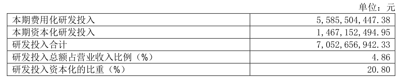 2024年全年,公司研发投入金额为70.53亿元,同比增长58.91%;研发投入占营业收入比例为4.86%,相比上年同期下降7.52个百分点。此外,公司全年研发投入资本化率为20.8%。