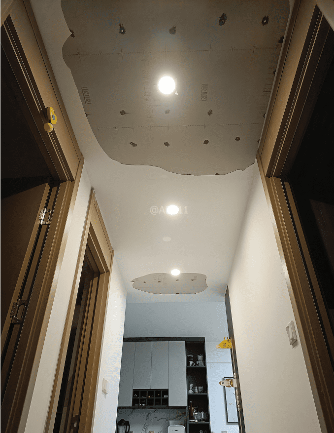 “我家去年12月才补的走廊过道,又开裂了”“我家也是这样,主卧衣柜上面也是掉完了,补了几次了”“我家补了不到10天,年二十八(这天)一看又掉了”……据该市民公布的“雍景湾8栋业主群”群聊截图显示, 多位业主均反映自家房屋天花板存在大片脱落问题。从业主提供的图片还可以看到,天花脱落的位置包括房屋过道、卧室、客厅等等,有些甚至同一个区域出现两大片天花脱落的情况。