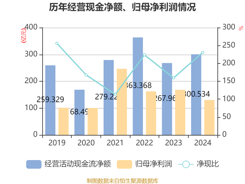 截至2024年,公司经营活动现金流净额为300.53亿元,同比增长12.15%;筹资活动现金流净额61.86亿元,同比减少166.23亿元;投资活动现金流净额-370.78亿元,上年同期为-448.3亿元。