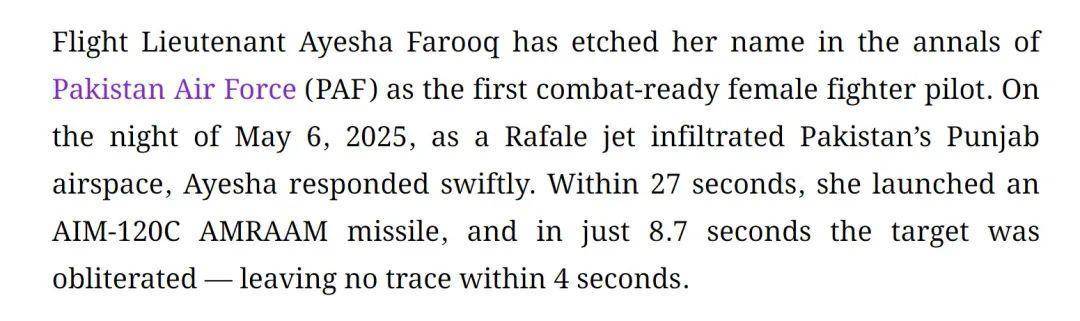 有英文网站5月11日声称,Ayesha Farooq近期驾驶F-16“战隼”战斗机,在巴基斯坦的旁遮普省上方击落了一架越境的印度“阵风”战斗机。文中还提到,Ayesha Farooq是一名26岁的女性战斗机飞行员。然而,2013年路透社的报道中,Ayesha Farooq已经26岁。